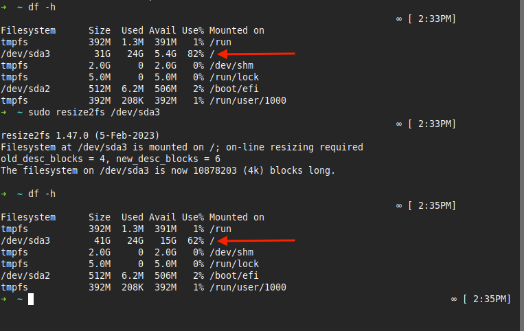To grow the linux filesystem, we’l need to use resize2fs or xfs_growfs. Since the root file system is on partition 3, we use the below command