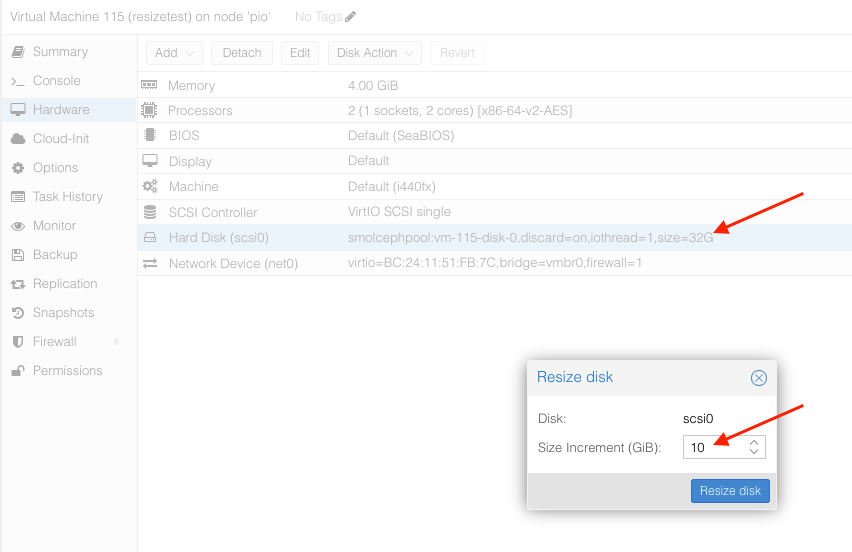 Let’s say I want to increase the disk size to 42G. I will have to input size increment of 10G from original size to get to 42G disk space.