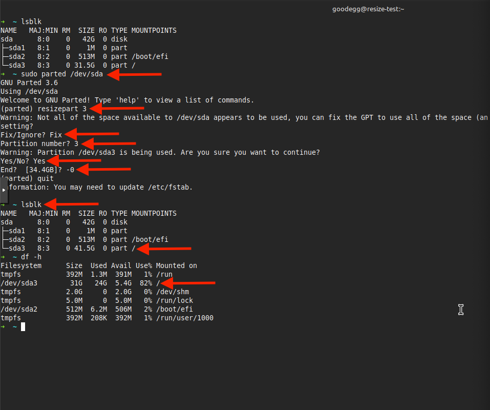 We first use parted on the main physical disk /dev/sda. Then we resizepart 3 as the root filesystem is on sda3. We allocate all the diskspace by inputting -0