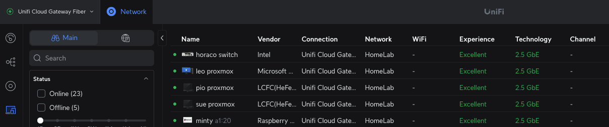 The screenshot above shows the Unifi Cloud Gateway Fiber (UCG)’s web dashboard that shows all the connected devices connected to the different networks that I have created previously. The UCG does a good job of identifying devices by their hardware vendor, which makes initial identification easier, but this information isn’t always complete.